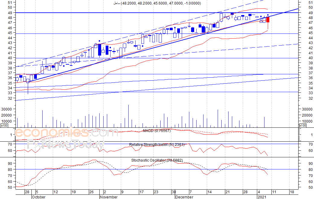 متوقع ان يكون النطاق السعري خلال اليوم الحالي بين مستوى الدعم هو 45.7 بينما مستوى المقاومة هو 48.3 فلس