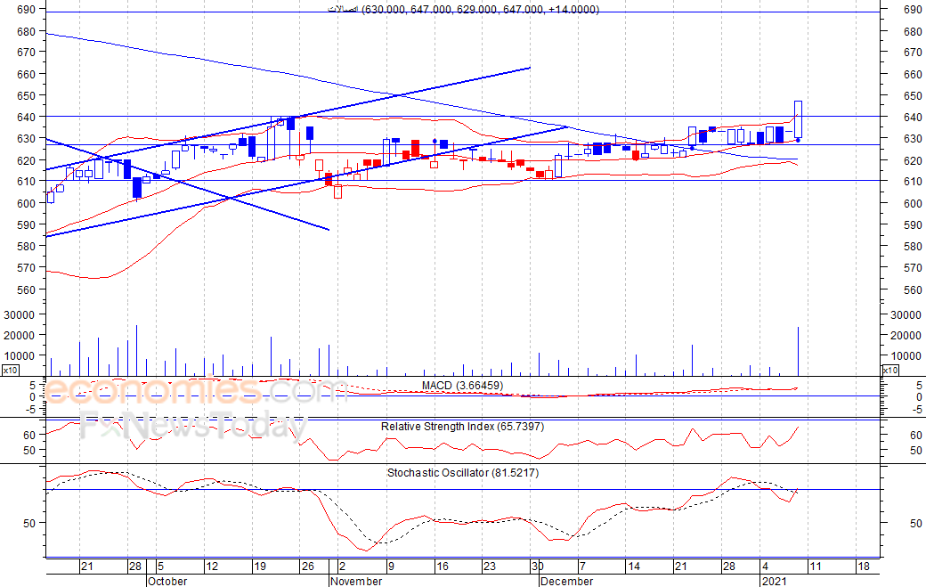 متوقع ان يكون النطاق السعري خلال اليوم الحالي بين مستوى الدعم هو 640 بينما مستوى المقاومة هو 655 فلس