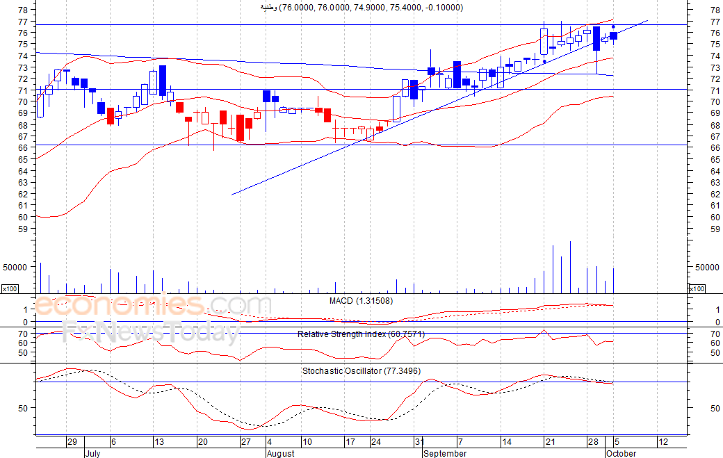 متوقع ان يكون النطاق السعري خلال اليوم الحالي بين مستوى الدعم هو 74.9 بينما مستوى المقاومة هو 76.0 فلس