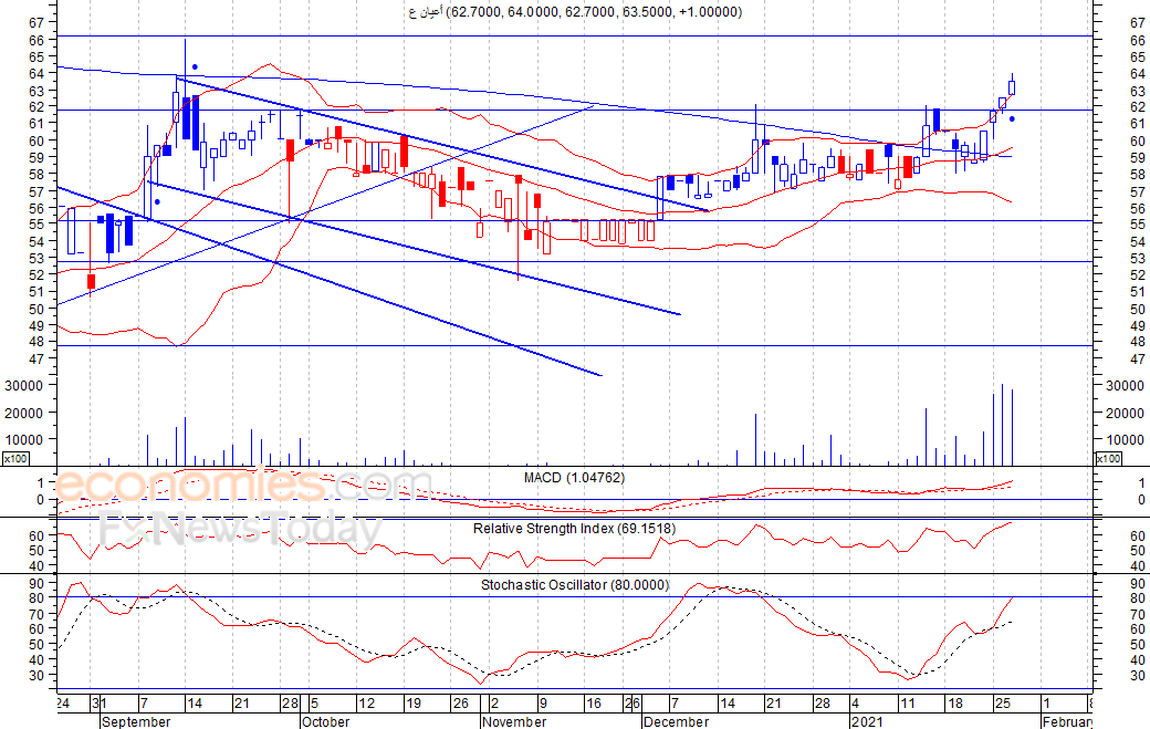 حقق السهم مكاسب كبيرة خلال تداولات امس الاربعاء، حيث اغلق عند مستوى 63.50 فلس، مصحوبا بارتفاع كبير في كمية التداول، كما اغلق السهم أعلى الحد العلوي لمؤشر "Bollinger Bands” ويتجه السهم حاليا لمستوى المقاومة التالي عند 66 فلس كمستوى أول ثم 70 فلس كمستوى ثان، شرط بقاء السهم أعلى مستوى 62 فلس.