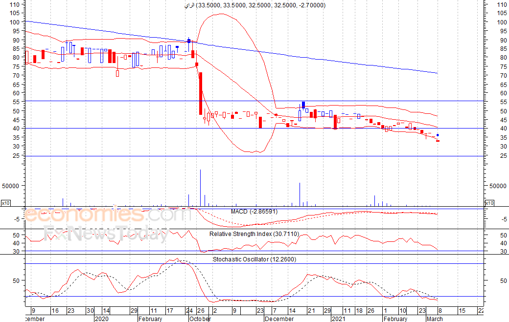 متوقع ان يكون النطاق السعري خلال اليوم الحالي بين مستوى الدعم هو 32.2 بينما مستوى المقاومة هو 33.2 فلس