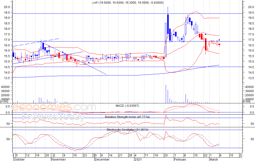 متوقع ان يكون النطاق السعري خلال اليوم الحالي بين مستوى الدعم هو 16.3 بينما مستوى المقاومة هو 16.6 فلس