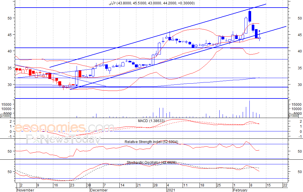 متوقع ان يكون النطاق السعري خلال اليوم الحالي بين مستوى الدعم هو 42.0 بينما مستوى المقاومة هو 45 فلس