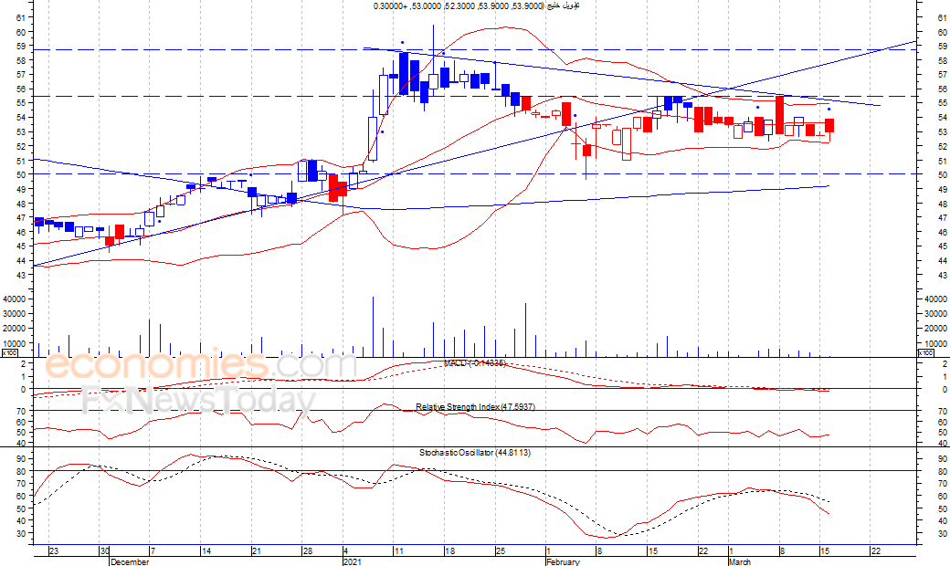 ارتفع السهم بشكل طفيف نهاية تداولات امس الثلاثاء، حيث اغلق عند مستوى 53 فلس، وذلك بعدما استهل الجلسة عند مستوى 53.90 فلس، في ظل استمرار تداول مؤشر ماكد اسفل خط الصفر، لذلك نتوقع ان ينخفض السهم مرة أخرى للوصول لمستوى الدعم 50 فلس، شرط بقاء السهم اسفل مستوى 55.50 فلس.