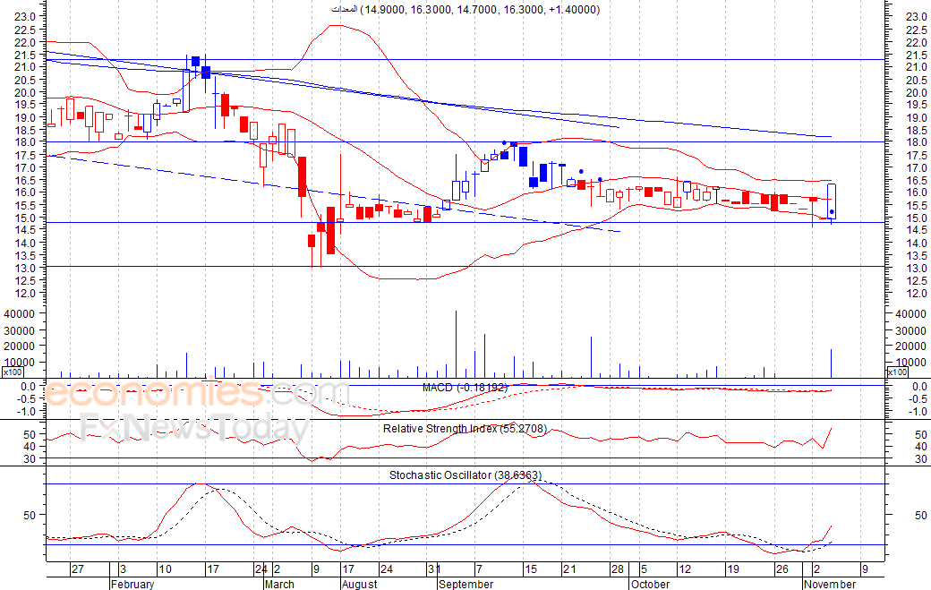 متوقع ان يكون النطاق السعري خلال اليوم الحالي بين مستوى الدعم هو 15.7 بينما مستوى المقاومة هو 17 فلس
