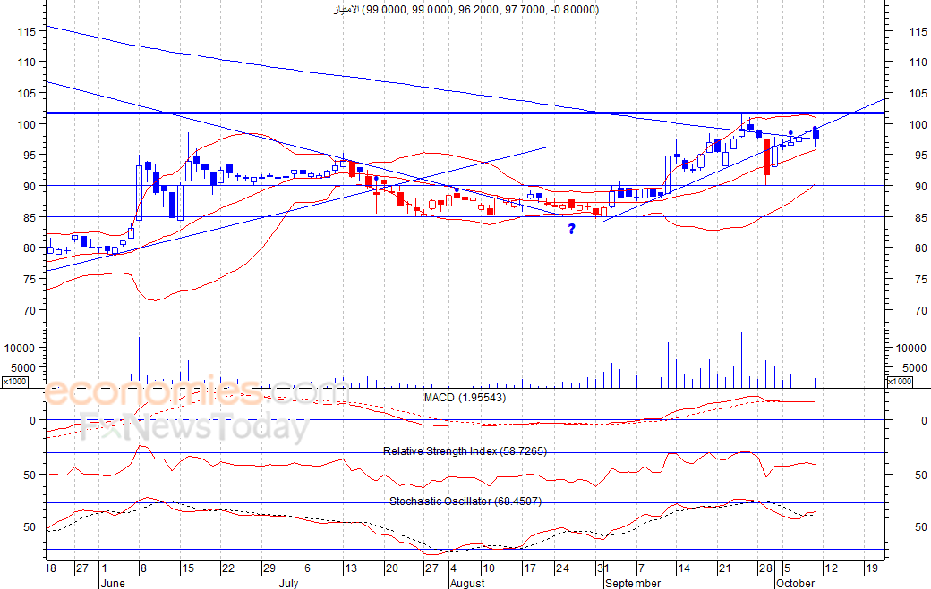 متوقع ان يكون النطاق السعري خلال اليوم الحالي بين مستوى الدعم هو 96.3 بينما مستوى المقاومة هو 99.1 فلس