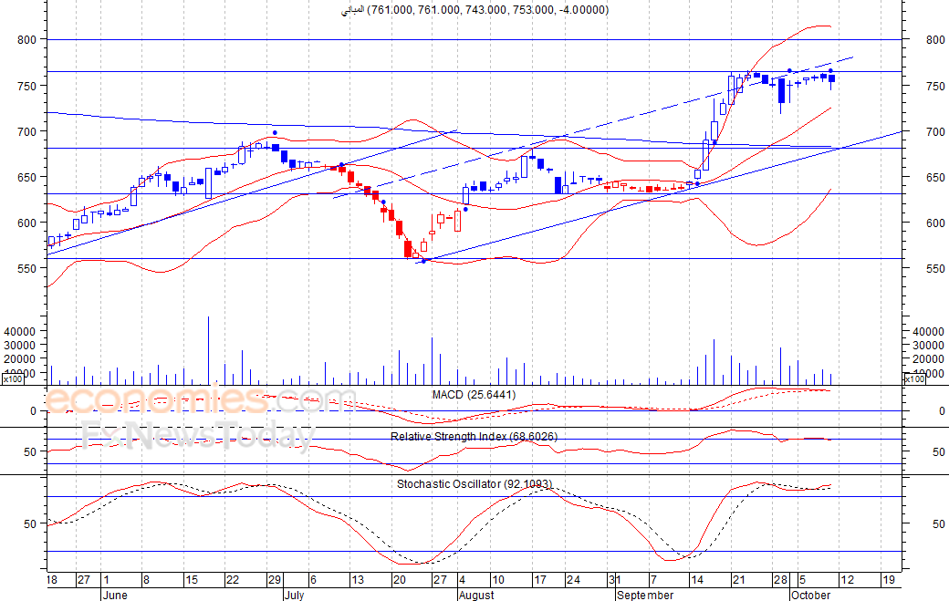 متوقع ان يكون النطاق السعري خلال اليوم الحالي بين مستوى الدعم هو 740 بينما مستوى المقاومة هو 760 فلس