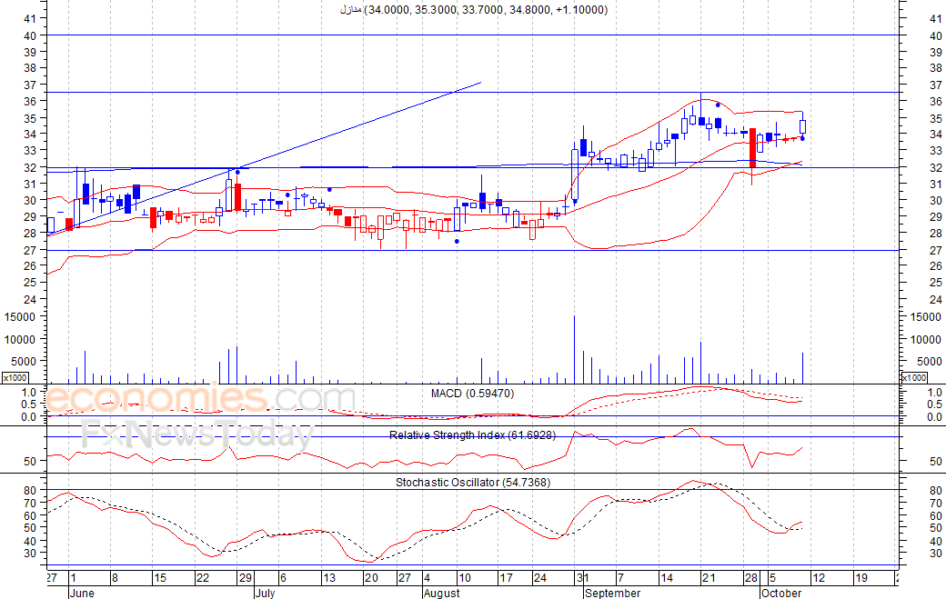 ارتد السهم لأعلى في اولى جلسات الأسبوع الحالي، حيث اغلق عند مستوى 34٫80 فلس، مصحوبا بارتفاع ضخم في كمية التداول، وهو ما يعد إشارة ايجابية، كما يلامس السهم حاليا متوسطه المتحرك لـ 20 يوم، والذي يشكل دعما قويا قد يدفع بالسهم لأعلى لمستويات قد تصل الى 36٫50 فلس كمستوى أول ثم 40 فلس كمستوى ثان، شرط بقاء السهم أعلى مستوى 33 فلس.