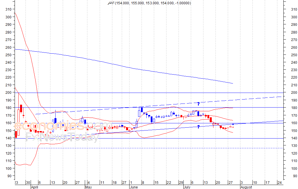 انخفض السهم لينهي تداولات اخر جلسات الأسبوع الماضي الأربعاء عند مستوى 154 فلس، مخترقا بذلك القناة الصاعدة متوسطة الأجل ، وهو ما ولد هدفا سعريا عند مستوى 125 فلس، ويتجه السهم حاليا لمستوى الدعم 140 فلس كمستوى أول ثم 125 فلس كمستوى ثان، شرط بقاء السهم اسفل مستوى 160 فلس.