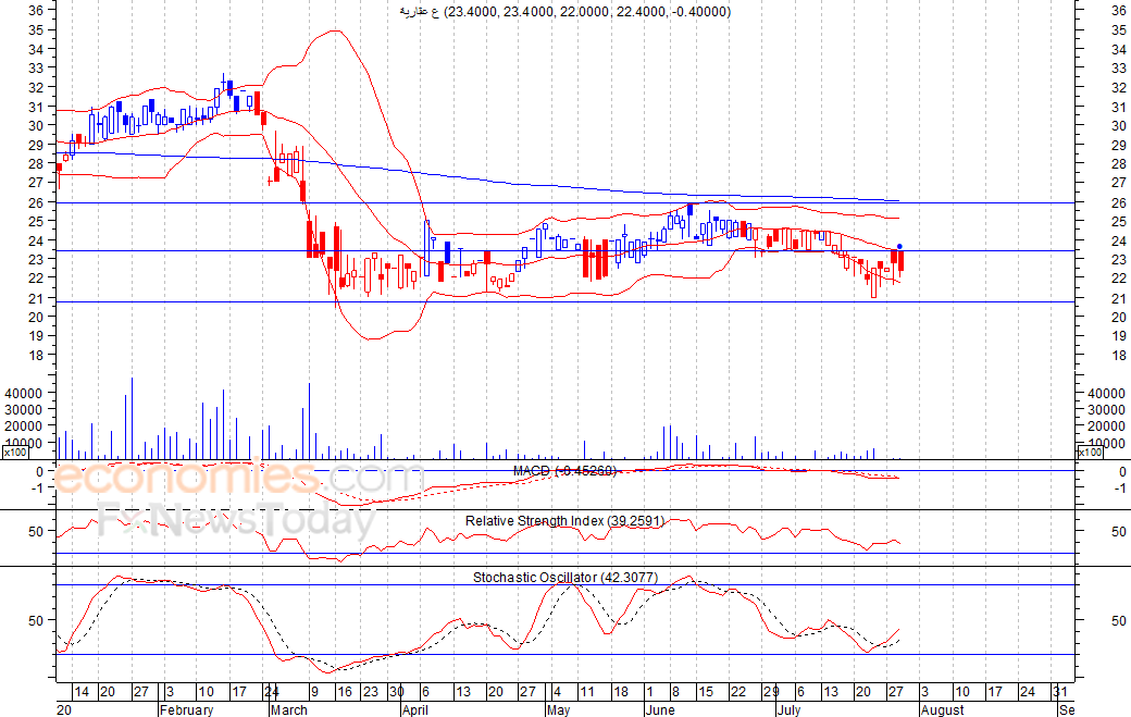 استهل السهم تداولات الأربعاء الماضي مرتفعا عند مستوى 23٫40 فلس، الا انه اغلق منخفضا عند مستوى 22٫40 فلس،وذلك بعدما تلقى مقاومة قوية بسبب ملامسته لمتوسطه المتحرك لـ 20 يوم، لذلك نتوقع ان يشهد السهم تراجعا خلال الأيام والاسابيع القادمة للوصول لمستوى الدعم 21 فلس كمستوى أول ثم 18 فلس كمستوى ثان، شرط بقاء السهم اسفل مستوى 24 فلس.
