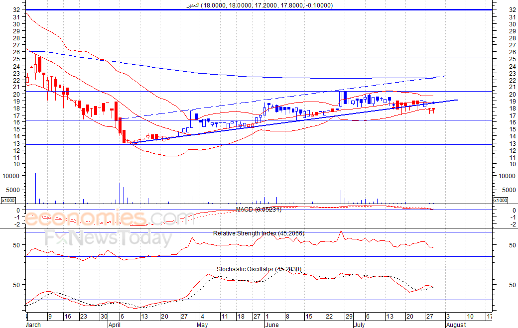 انخفض السهم لينهي تداولات الأربعاء الماضي عند مستوى 17٫80 فلس، مخترقا بذلك القناة الصاعدة متوسطة اجل، مما ولد هدفا سعريا عند مستوى 13 فلس، ويتجه السهم حاليا لمستوى الدعم 16 فلس، والذي نحذر من اختراق، حيث في هذه الحالة سيواصل تراجعه لمستوى الدعم التالي عند 13 فلس، شرط عدم تجاوز السهم لمستوى 21  فلس.