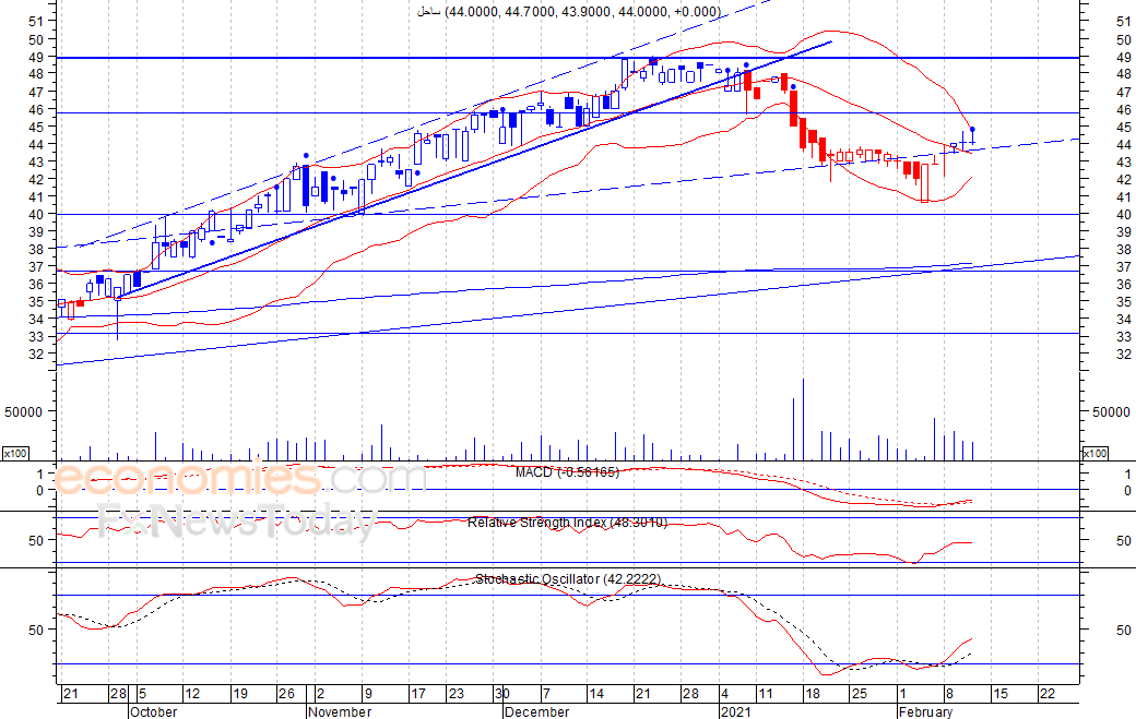أنهى السهم تداولات اخر جلسات الأسبوع الحالي بدون اي تغيير مقارنة بإغلاقه السابق، حيث اغلق عند مستوى 44 فلس، مقتربا من الحد العلوي لمؤشر "Bollinger Bands” والذي نتوقع ان يساهم في دفع السهم لأسفل للوصول لمستوى الدعم 40 فلس، شرط بقاء السهم اسفل مستوى 46 فلس.