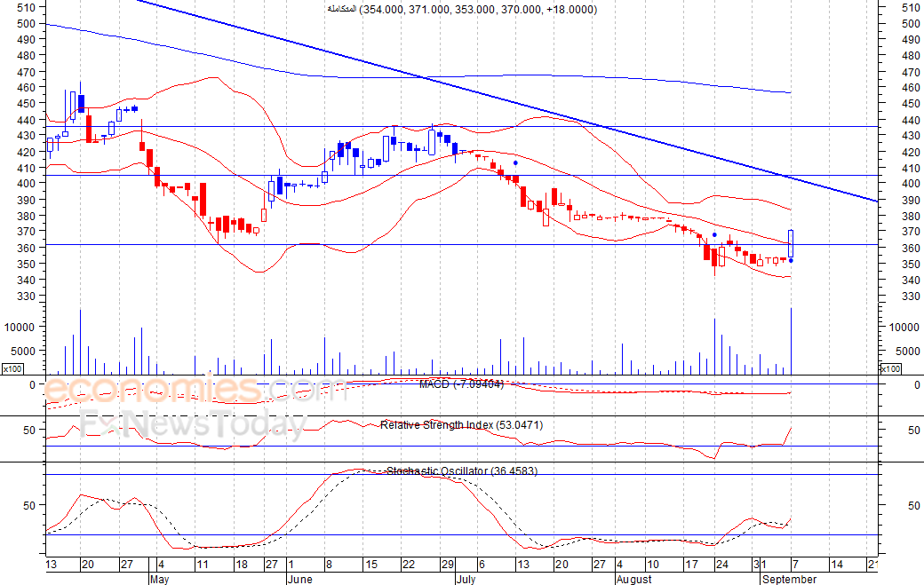 متوقع ان يكون النطاق السعري خلال اليوم الحالي بين مستوى الدعم هو 365 بينما مستوى المقاومة هو 380 فلس