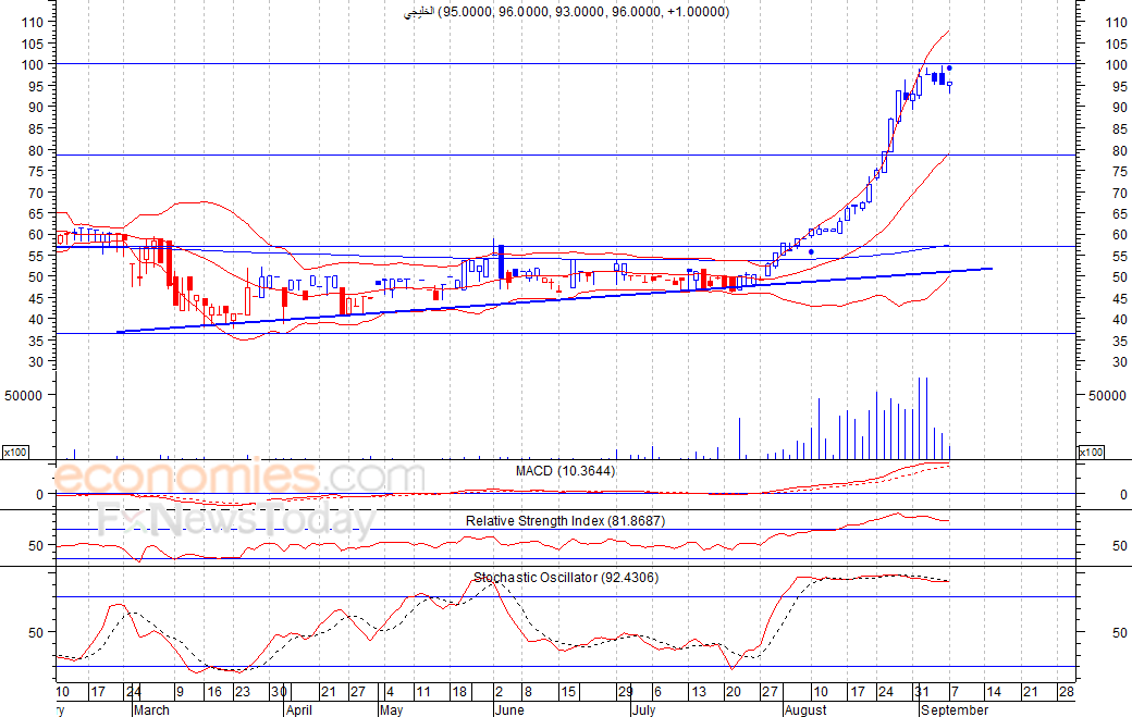 متوقع ان يكون النطاق السعري خلال اليوم الحالي بين مستوى الدعم هو 93.0 بينما مستوى المقاومة هو 97.0 فلس