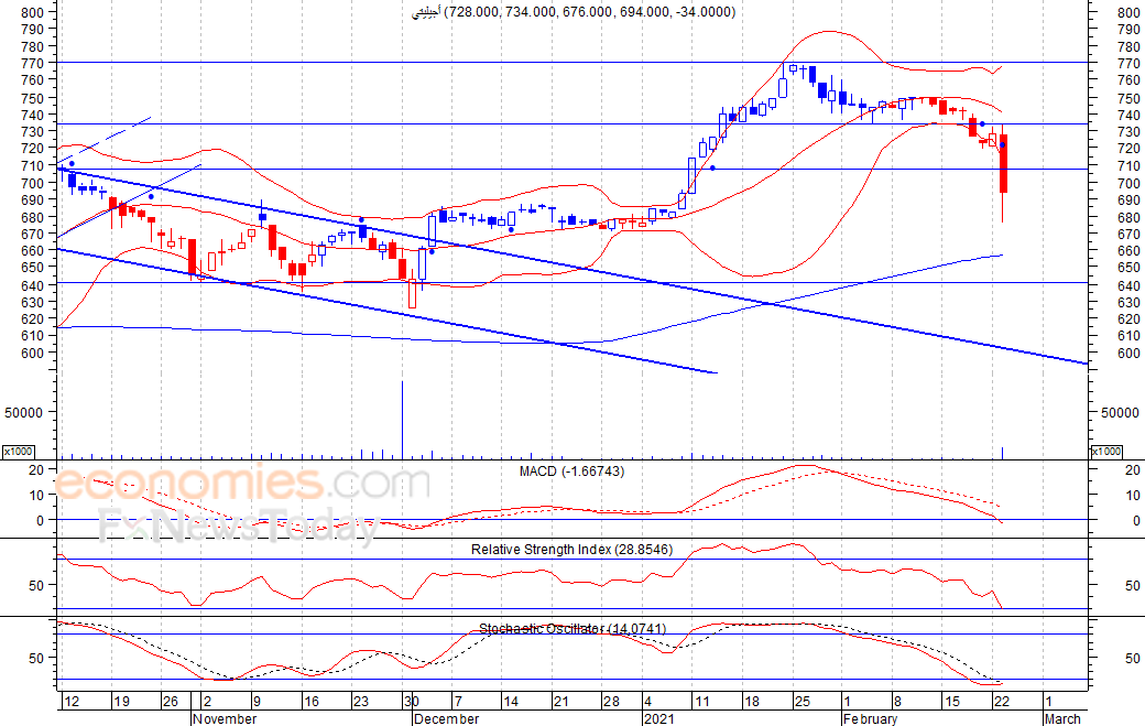 متوقع ان يكون النطاق السعري خلال اليوم الحالي بين مستوى الدعم هو 670 بينما مستوى المقاومة هو 700 فلس
