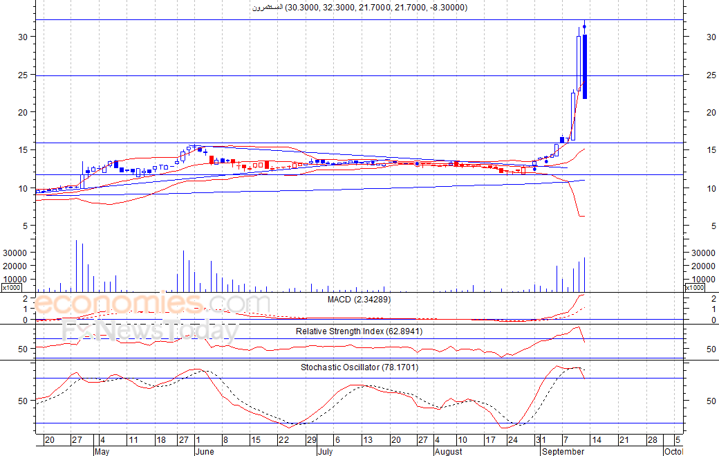 متوقع ان يكون النطاق السعري خلال اليوم الحالي بين مستوى الدعم هو 18.2 بينما مستوى المقاومة هو 25 فلس