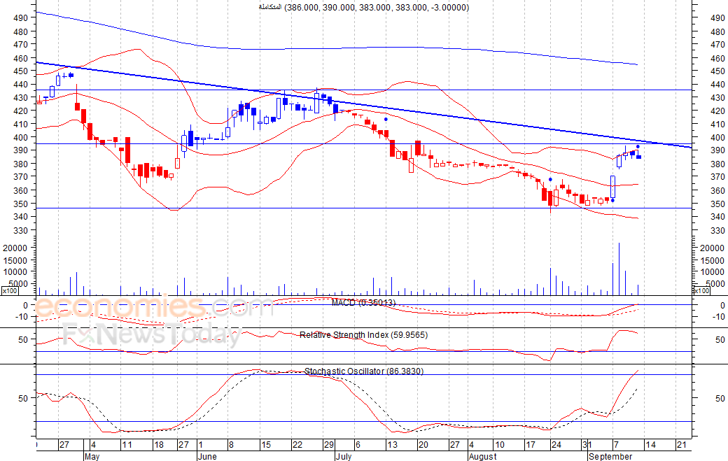 متوقع ان يكون النطاق السعري خلال اليوم الحالي بين مستوى الدعم هو 380.7 بينما مستوى المقاومة هو 387.7 فلس