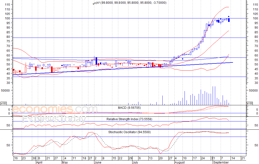 متوقع ان يكون النطاق السعري خلال اليوم الحالي بين مستوى الدعم هو 94.5 بينما مستوى المقاومة هو 98.5 فلس