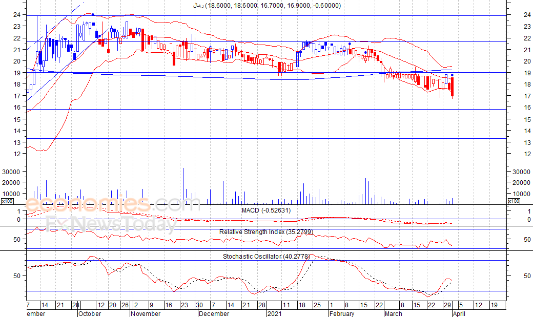 عمق السهم من خسائره كما اشرنا في تقريرنا الأخير، حيث اغلق عند مستوى 16.90 ريال، في ظل انطلاق إشارة بيع على مؤشر ماكد، مما يمهد الطريق امام السهم لمزيد من الانخفاض للوصول لمستوى الدعم 15.50 ثم 13 فلس، شرط ثبات السهم اسفل مستوى 19 فلس.
