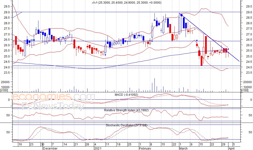 ومن المتوقع ان يكون النطاق السعري خلال جلسة اليوم بين مستوى الدعم هو 24.7 فلس وبين مستوى المقاومة هو 25.5 فلس