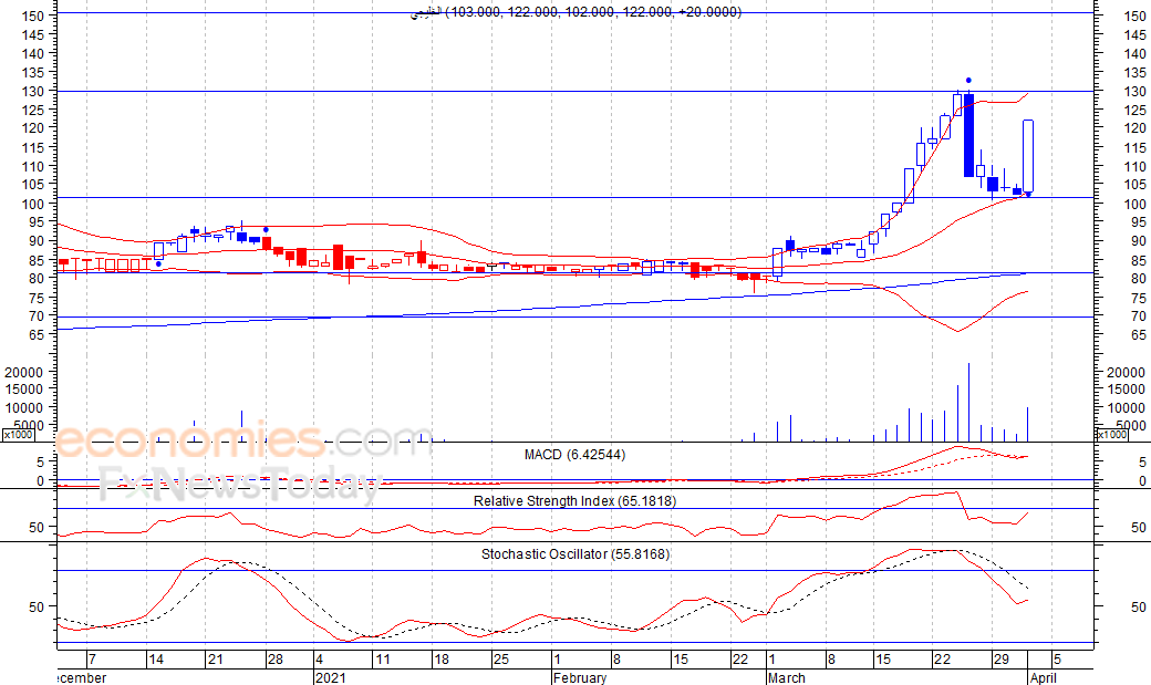 ومن المتوقع ان يكون النطاق السعري خلال جلسة اليوم بين مستوى الدعم وهو 115 وبين مستوى المقاومة هو 133 فلس