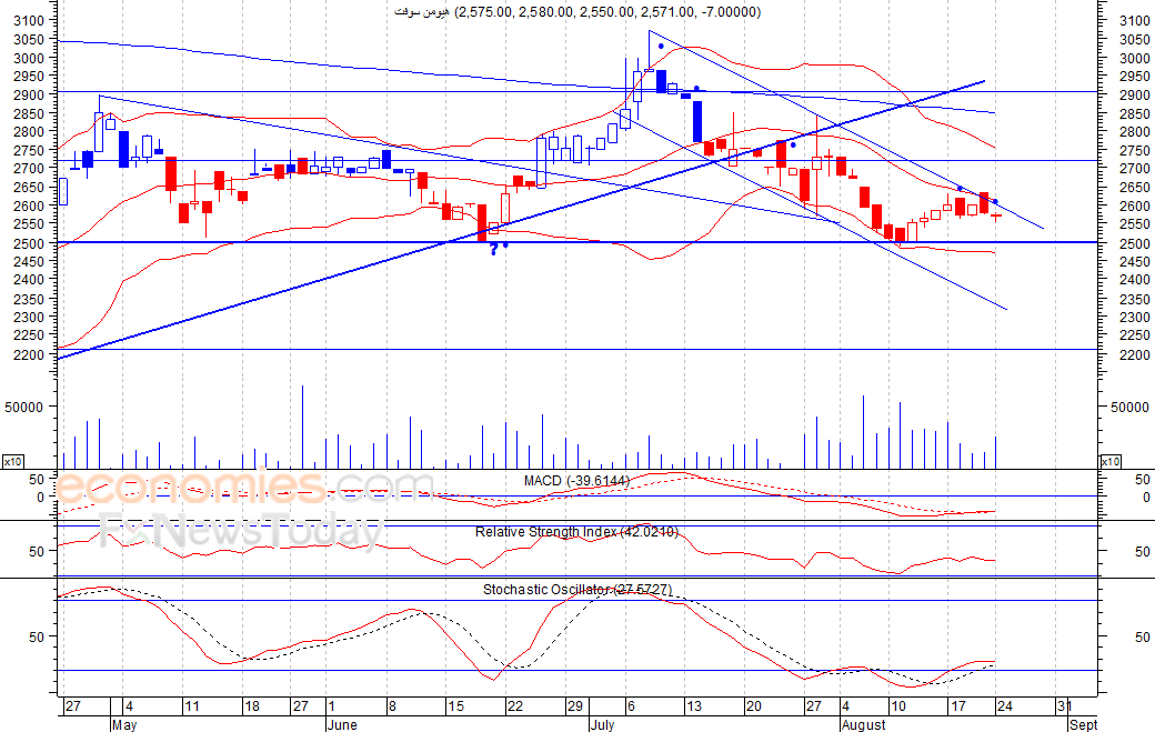مازال السهم يتداول في قناة هابطة قصيرة الأجل، حيث اغلق امس الاثنين منخفضا عند مستوى 2571 فلس، ملامسا بذلك الحد العلوي للقناة الهابطة قصيرة الأجل، والذي يشكل مقاومة قد تضغط على السهم في الأجل القصير للوصول لمستويات قد تصل الى 2500 فلس كمستوى أول ثم 2200 فلس كمستوى ثان، شرط بقاء السهم اسفل مستوى 2650 فلس.