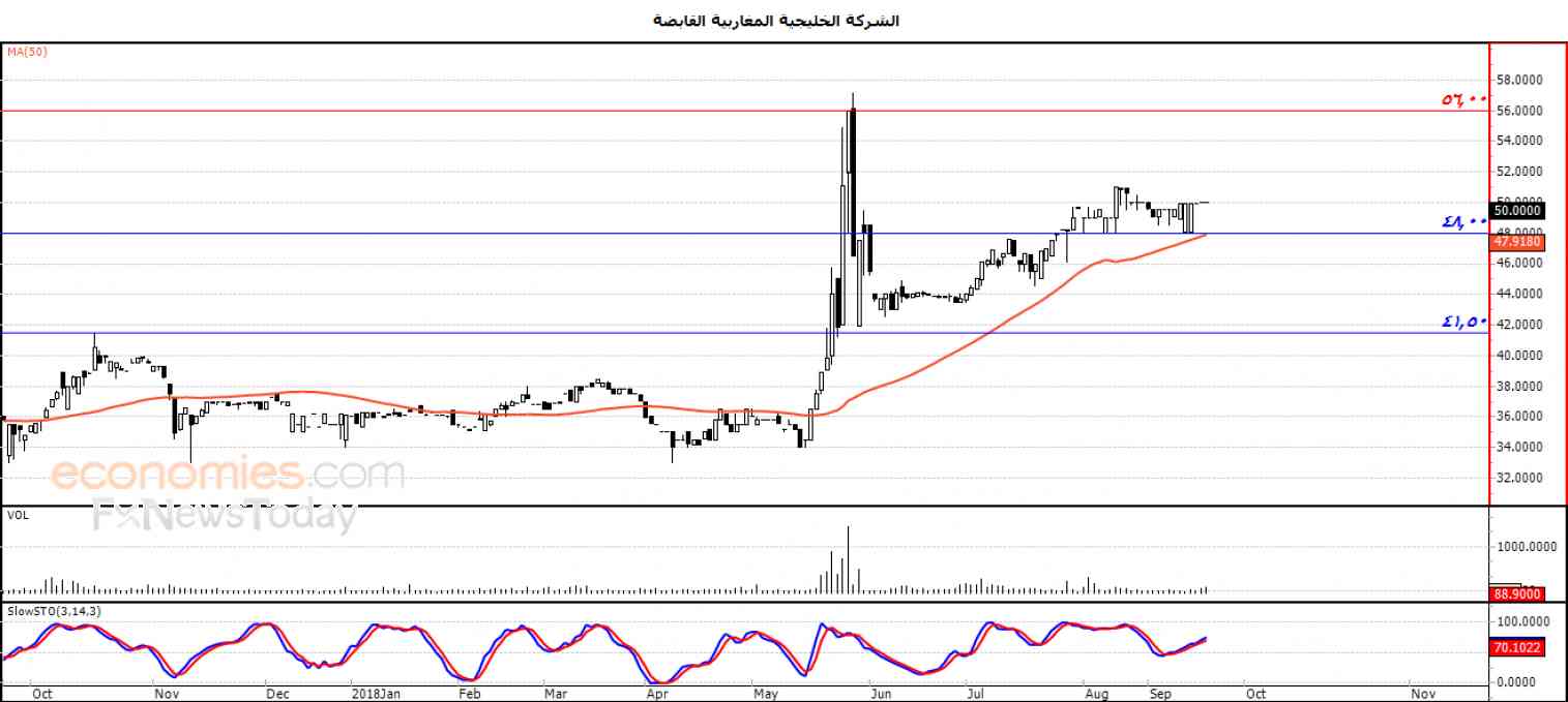 أغلق سهم الشركة الخليجية المغاربية القابضة (GNAHC) على عدم تغيير ، وذلك في ظل سيطرة الاتجاه الصاعد على المدى القصير ، مع توارد الإشارات الإيجابية بمؤشرات القوة النسبية ، تحت تواصل الضغط الإيجابي للمتوسط المتحرك البسيط لفترة 50 يوماً السابقة ، وأخيراً مع استقرار تداولاته أعلى مستوى الدعم 48.00 .