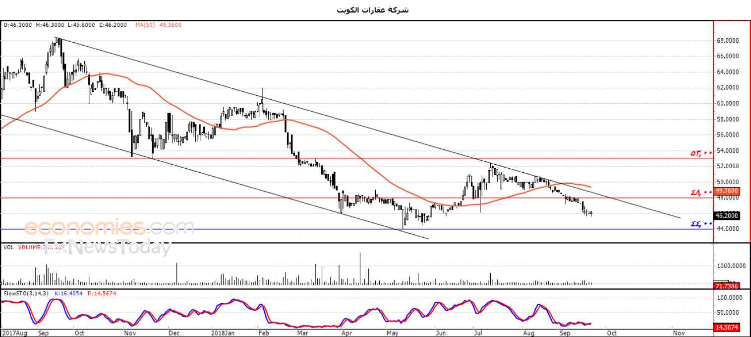 وسط تداولات سهم شركة العقارات الكويت (KRE) بنطاق قناة سعريه هابطة على المدى المتوسط كما هو موضح بالرسم البياني المرفق ، يأتي ارتفاع السهم بآخر جلساته في محاولة منه لتصريف تشبعه البيعي الواضح بمؤشرات القوة النسبية ، وتعويض بعض خسائره السابقة ، ليحقق بذلك أرباحاً بلغت نسبتها 0.43% بما يعادل 0.20 نقطة ، وسط استمرار الضغط السلبي للمتوسط المتحرك البسيط لفترة 50 يوماً السابقة .