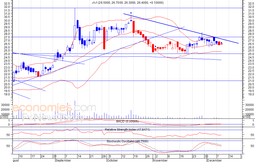 متوقع ان يكون النطاق السعري خلال اليوم الحالي بين مستوى الدعم هو 26.2 بينما مستوى المقاومة هو 26.6 فلس