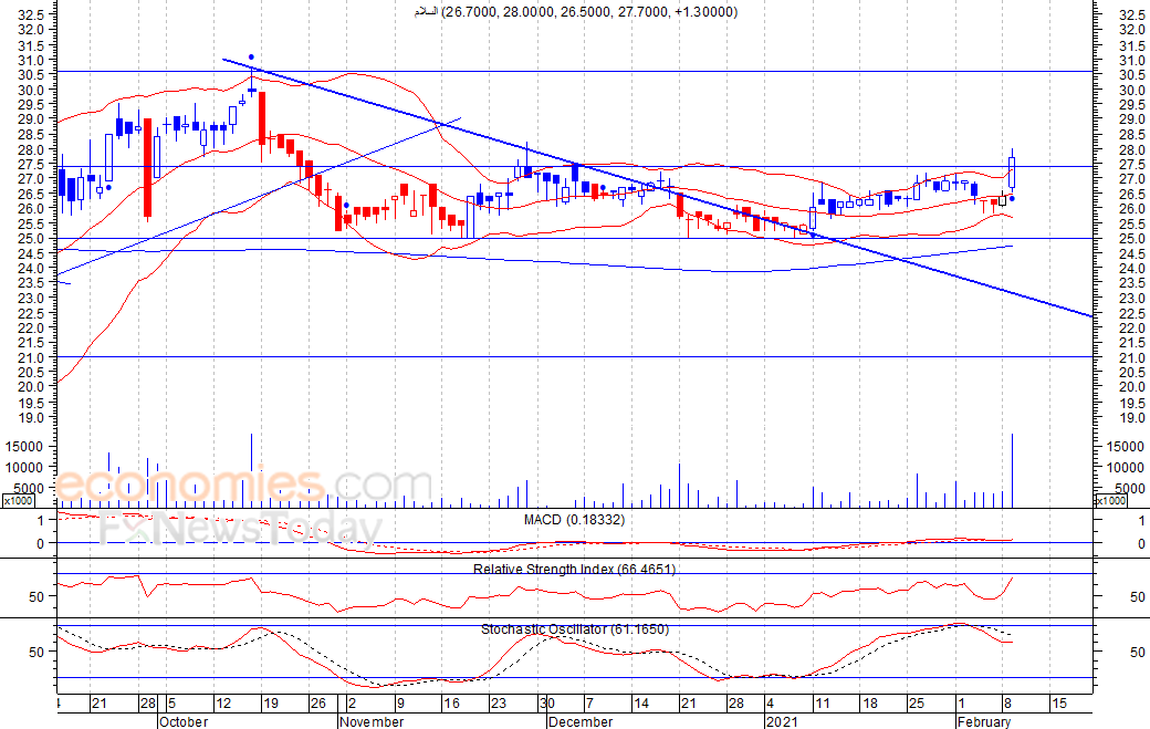تمكن السهم من الارتفاع مرة أخرى ليغلق امس الثلاثاء عند مستوى 27.70 فلس، في ظل ارتفاع ضخم في كمية التداول، وهو ما يعد إشارة ايجابية، كما اطلق مؤشر ماكد إشارة شراء، لذلك نتوقع استمرار الارتفاع الحالي لمستوى المقاومة التالي عند 30.50 فلس، شرط بقاء السهم أعلى مستوى 27 فلس.