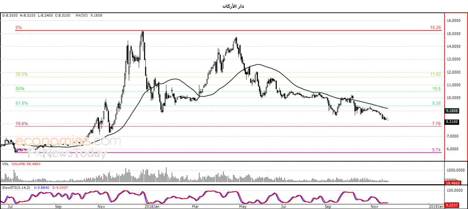 انخفض سهم دار الأركان (4300) في آخر جلساته ، وذلك في ظل استقرار تداولاته أدنى مستوى المقاومة 9.38 ، هذا المستوى الذي يمثل نسبة 61.8% من مستويات فيبوناتشي التصحيحية للموجة الصاعدة على المدى المتوسط (من 5.74 إلى 15.26) ، مع استمرار الضغط السلبي للمتوسط المتحرك البسيط لفترة 50 يوماً السابقة ، ليسجل خسائر بلغت نسبتها -0.84% بما يعادل -0.07 ريال .
