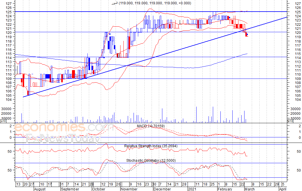 أنهى السهم تداولات امس الأربعاء بدون اي تغيير مقارنة بإغلاقه السابق، حيث اغلق عند مستوى 119 فلس، مخترقا خط ا لاتجاه الصاعد طويل الأجل، كما انزلق السهم اسفل مستوى الدعم السابق عند 120 فلس، مما يمهد الطريق أمام السهم لمزيد من الانخفاض لمستوى الدعم التالي عند 114 فلس كمستوى ثان، شرط بقاء السهم اسفل مستوى 121 فلس.