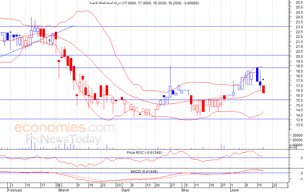 تحرك السهم لأسفل ليغلق عند مستوى 16٫20 فلس، مخترقا متوسطه المتحرك لـ 20 يوم، مما يعد إشارة سلبية، كما إطلاق مؤشر "PriceROC” إشارة بيع، لذلك نتوقع مزيدا من الانخفاض في الأجل القصير للوصول لمستوى الدعم 15٫50 ريال كمستوى أول ثم 13٫50 فلس كمستوى ثان، شرط بقاء السهم اسفل مستوى 19 فلس.