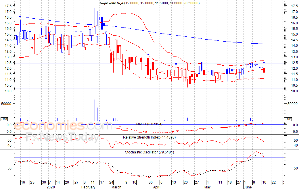 انخفض السهم في رابع جلسات الأسبوع الحالي، حيث اغلق امس الأربعاء عند مستوى 11٫60 فلس، وهو أدني مستوى يصل اليه السهم خلال الجلسة، في ظل إنطلاق إشارة بيع على مؤشر استوكاستيك، لذلك نتوقع ان يشهد السهم مزيدا من الانخفاض لمستوى الدعم الهام عند 10٫20 فلس، شرط بقاء السهم اسفل مستوى 12٫50 فلس.