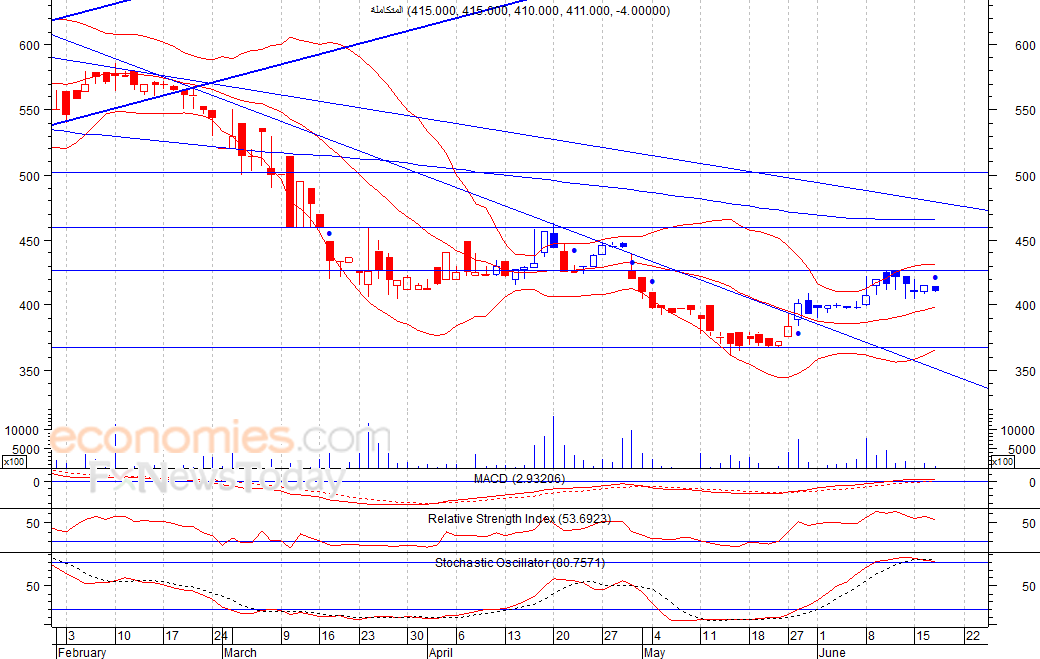 تحرك السهم لأسفل لينهي تداولات امس الأربعاء عند مستوى 411 فلس، وذلك بعدما تلقى مقاومة عند مستوى 430 فلس، في ظل استمرار تدني كميات التداول، كما نلاحظ انطلاق إشارة بيع على مؤشر استوكاستيك، لذلك نتوقع عمليات جني أرباح قد تهبط بالسهم لمستوى الدعم 370 فلس، شرط بقاء السهم اسفل مستوى 430 فلس.