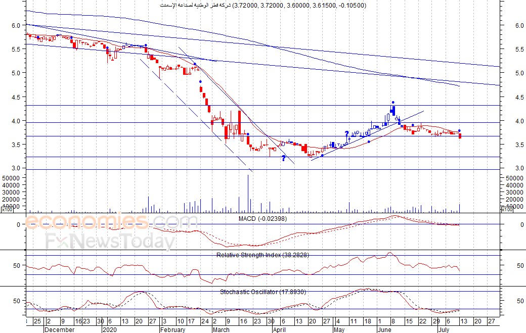 شهد السهم انخفاضا في ثاني جلسات الأسبوع الحالي، حيث اغلق عند مستوى 3٫615 ريال، مخترقا بذلك مستوى الدعم السابق عند 3٫66 ريال، مصحوبا بارتفاع كمية التداول، وهو ما يعد إشارة سلبية قد تهبط به لمستوى الدعم التالي عند 3٫20 ريال كمستوى اول، شرط عدم تجاوز السهم لمستوى 3٫8 ريال.