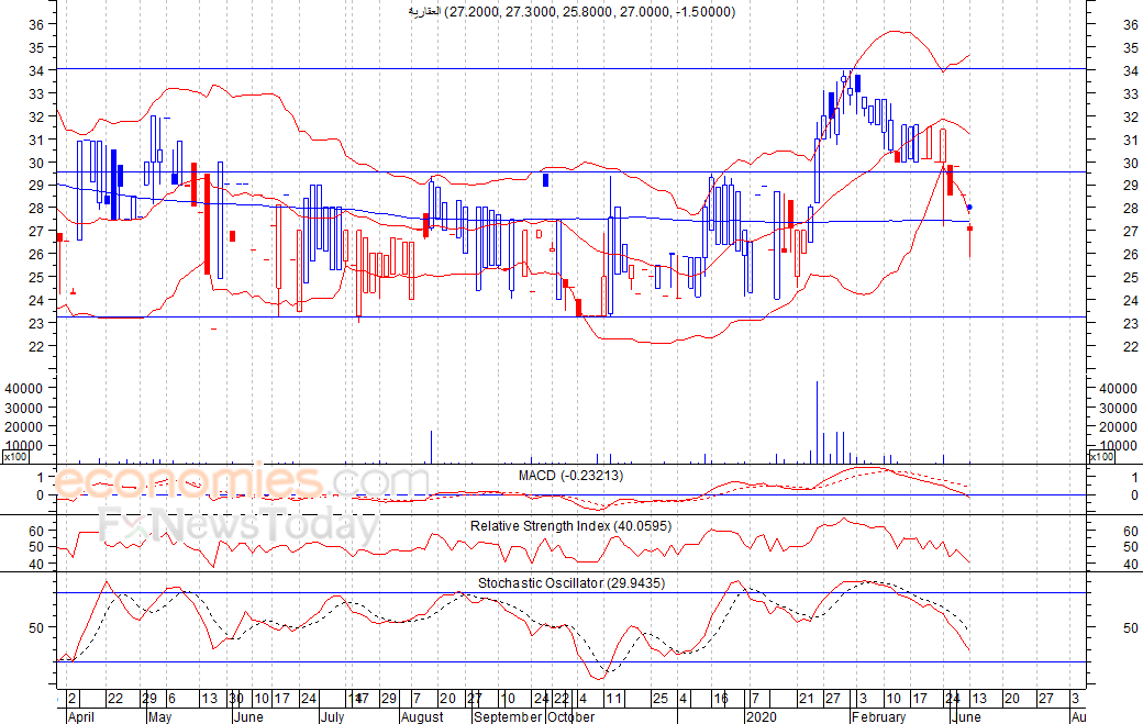 متوقع ان يكون النطاق السعري خلال اليوم الحالي بين مستوى الدعم هو 26.1 بينما مستوى المقاومة هو 27.6 فلس