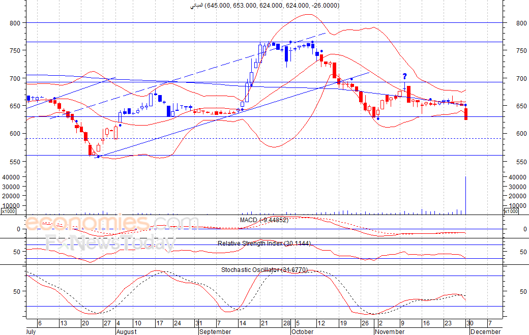متوقع ان يكون النطاق السعري خلال اليوم الحالي بين مستوى الدعم هو 613 بينما مستوى المقاومة هو 635 فلس
