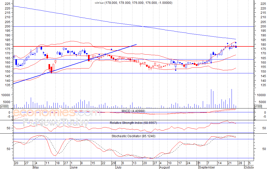 أنهى السهم تداولات امس الأحد ليغلق عند مستوى 176 فلس، في ظل تدني ملحوظ لكمية التداول لثاني جلسة على التوالي، وبالتزامن مع انطلاق إشارة بيع على مؤشر القوة النسبية، لذلك نتوقع ان يشهد السهم عمليات جني أرباح قد تهبط به لمستوى الدعم 163 ريال كمستوى أول، شرط بقاء السهم اسفل مستوى 182 فلس.