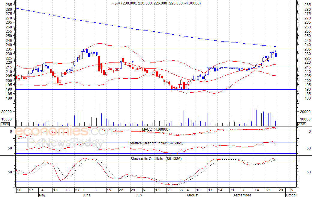 تراجع السهم لينهي تداولات امس الأحد ليغلق عند مستوى 226 فلس، في ظل استمرار تراجع كميات التداول، كما نلاحظ انطلاق إشارة بيع على مؤشر القوة النسبية، لذلك نتوقع ان يشهد السهم عمليات جني أرباح قد تهبط به لمستوى الدعم 215 فلس كمستوى اول، شرط بقاء السهم اسفل مستوى 235 فلس.