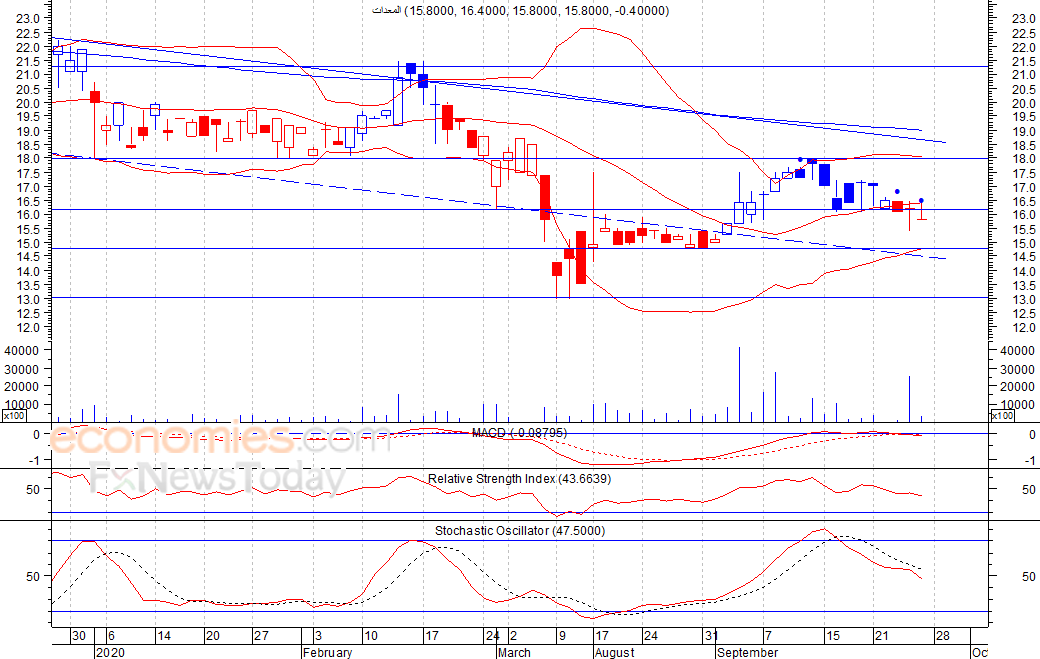 متوقع ان يكون النطاق السعري خلال اليوم الحالي بين مستوى الدعم هو 15.6 بينما مستوى المقاومة هو 16.2 فلس