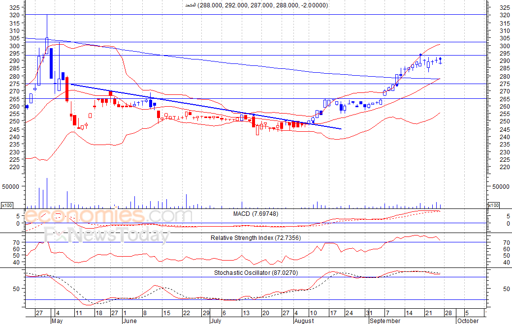 متوقع ان يكون النطاق السعري خلال اليوم الحالي بين مستوى الدعم هو 285 بينما مستوى المقاومة هو 290 فلس