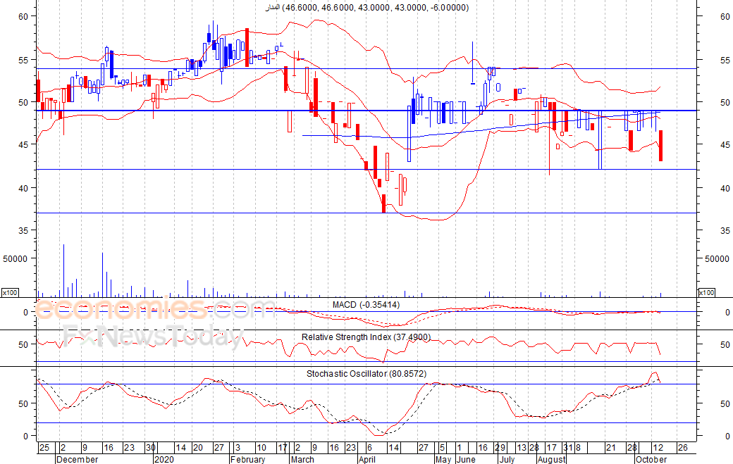 متوقع ان يكون النطاق السعري خلال اليوم الحالي بين مستوى الدعم هو 41.8 بينما مستوى المقاومة هو 45 فلس