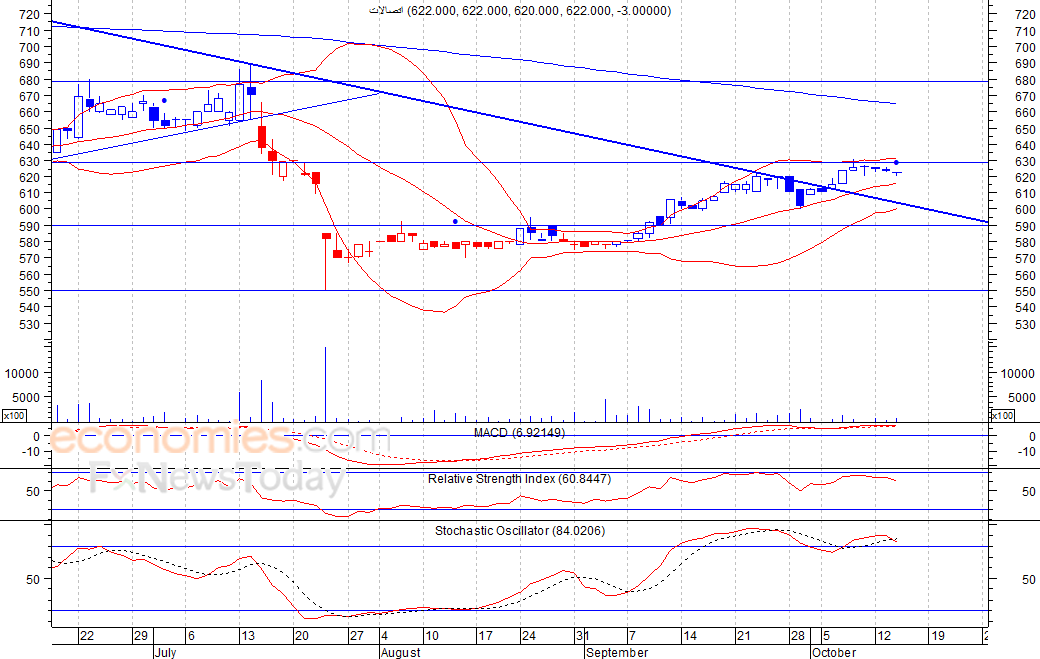 مازال السهم يتداول في نطاق ضيق للغاية منذ بداية الأسبوع الحالي، حيث اغلق امس الأربعاء منخفضا عند مستوى 622 فلس، ملامسا لمستوى المقاومة الحالي عند 630 فلس، كما يقترب السهم حاليا من الحد العلوي لمؤشر "Bollinger Bands” مما قد يضغط على السهم لأسفل للوصول لمستوى الدعم 590 فلس كمستوى اول، شرط بقاء السهم اسفل مستوى 630 فلس.
