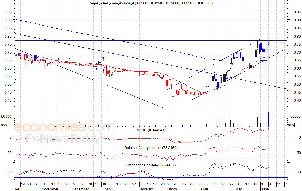 سيطرت القوى الشرائية على تداولات السهم خلال جلسة امس الاثنين، حيث اغلق عند مستوى 0٫825 ريال، وهو أعلى مستوى يصل اليه السهم منذ شهر يوليو من العام الماضي، متجاوزا مستوى مقاومته السابق عند 0٫77 ريال، وفي ظل ارتفاع كبير في كمية التداول، لذلك نتوقع الوصول لمستوى 0٫90 ثم 0٫98 ريال، شرط بقاء السهم أعلى مستوى 0٫75 ريال.
