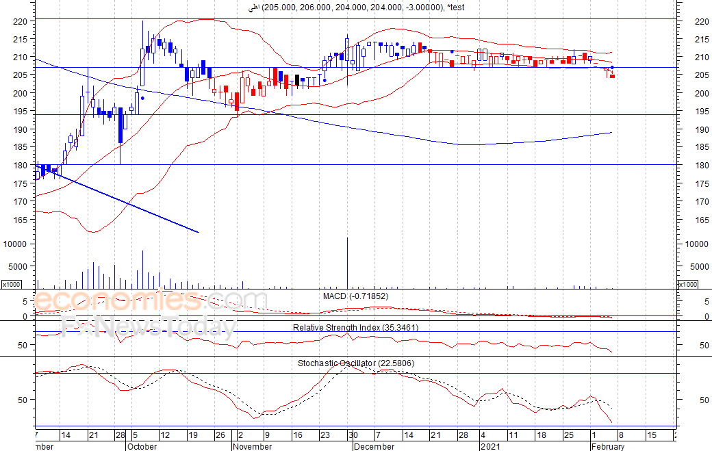 متوقع ان يكون النطاق السعري خلال اليوم الحالي بين مستوى الدعم هو 202 بينما مستوى المقاومة هو 205 فلس
