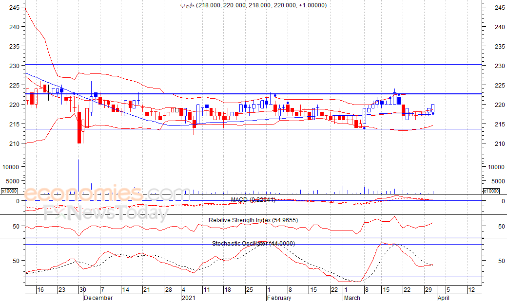 ومن المتوقع ان يكون النطاق السعري خلال جلسة اليوم بين مستوى الدعم وهو 218 وبين مستوى المقاومة هو 223 فلس