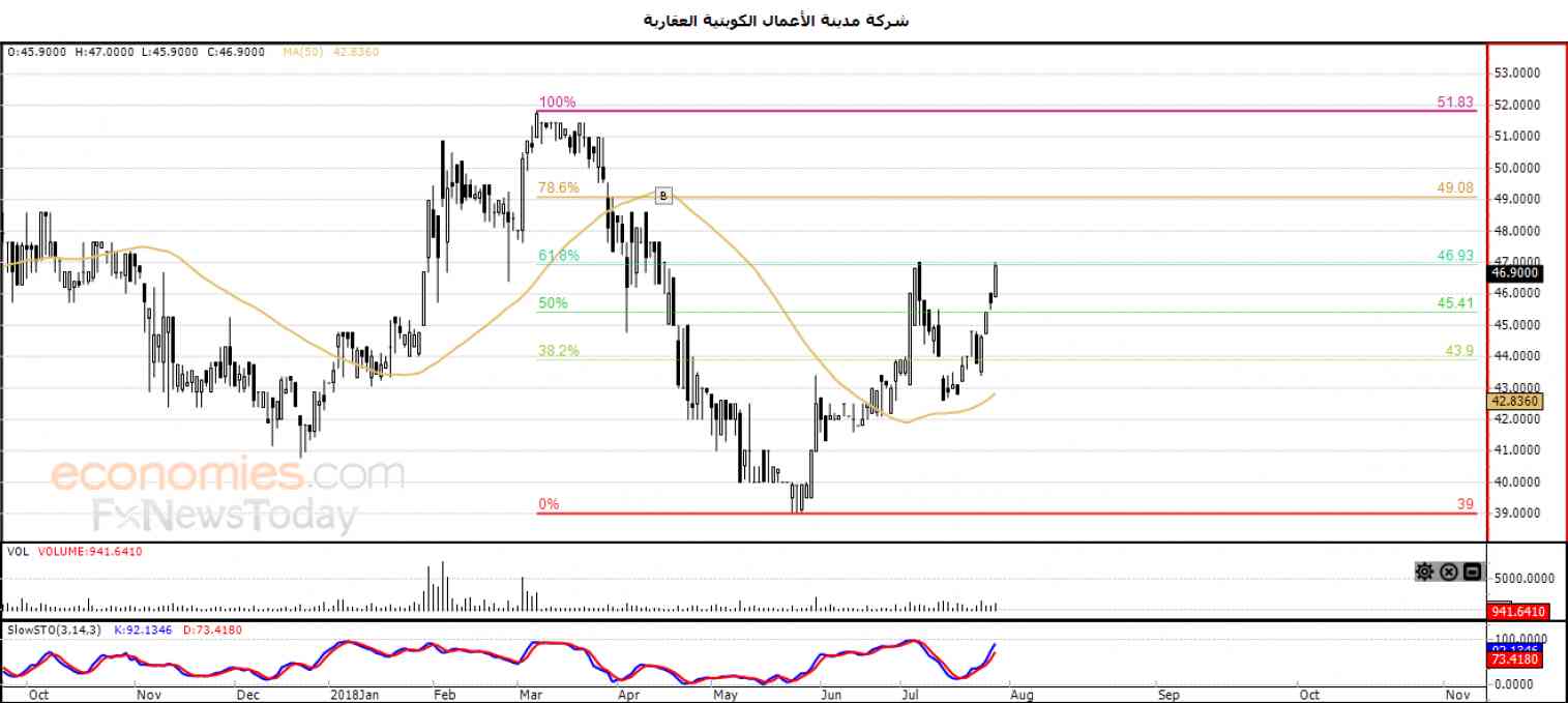 قفز السهم ارتفاعاً بجلسته الأخيرة ، ليهاجم مستوى المقاومة المهم 46.93 ، هذا المستوى الذي يمثل نسبة 61.8% من مستويات فيبوناتشي التصحيحية للموجة الهابطة على المدى القصير (من 51.83 إلى 39.00) ، ليحقق السهم بذلك أرباحاً بلغت نسبتها 2.63% بما يعادل 1.20 نقطة ، وذلك مع استمرار الضغط الإيجابي للمتوسط المتحرك البسيط لفترة 50 يوماً السابقة ، مع توارد الإشارات الإيجابية بمؤشرات القوة النسبية .