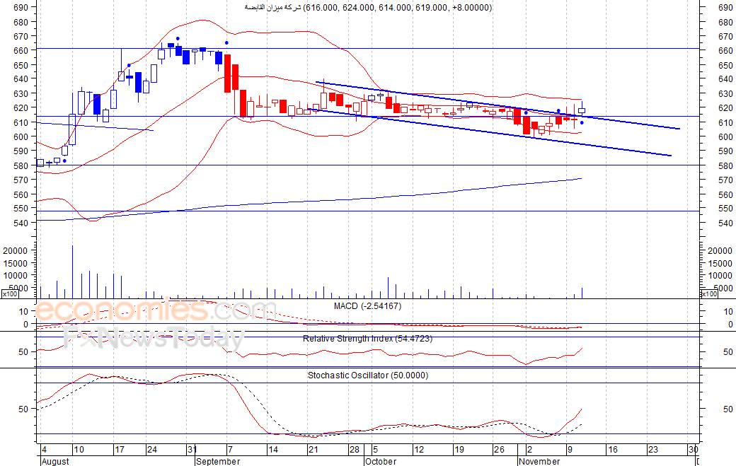 تمكن السهم من الارتفاع مرة أخرى ليغلق امس الأربعاء عند مستوى 619 فلس، لينجح بذلك في تجاوز القناة الهابطة قصيرة الأجل، مما يفتح الباب أمام السهم لمزيد من الارتفاع لمستويات قد تصل الى 640 فلس كمستوى أول ثم 660 فلس كمستوى ثان، شرط بقاء السهم أعلى مستوى 610 فلس.