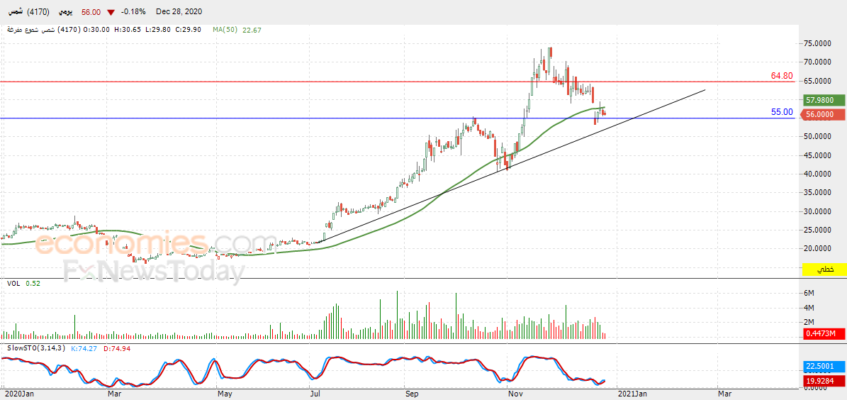 لذلك تشير توقعاتنا إلى ترجيح سيناريو ارتفاع السهم خلال تداولاته القادمة، طيلة ثبات الدعم 55.00، ليستهدف أولى مستويات المقاومة عند 64.80.